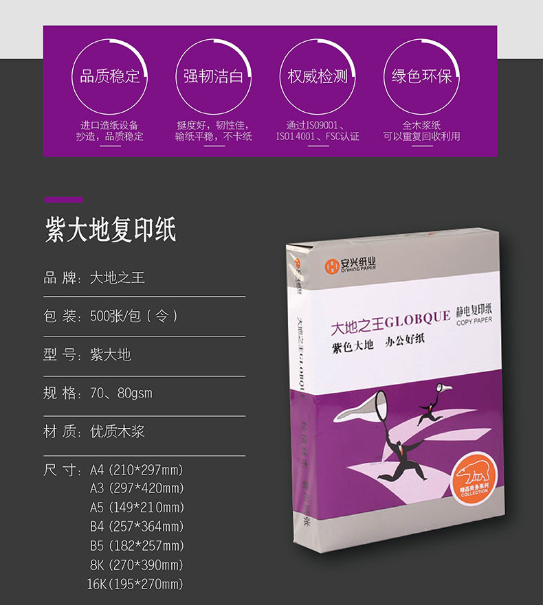 紫大地之王复印纸 70G 16K 500S 10包/箱
