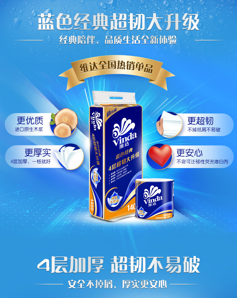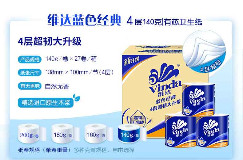 民用-维达(Vinda)160g四层蓝色经典卷筒卫生纸60卷...