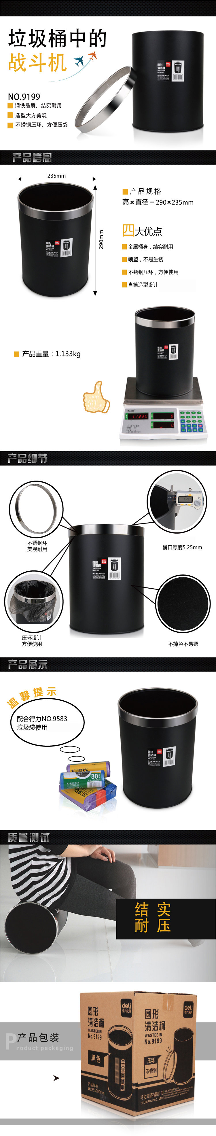 得力 9199 办公家居经典圆形直桶不锈钢垃圾桶